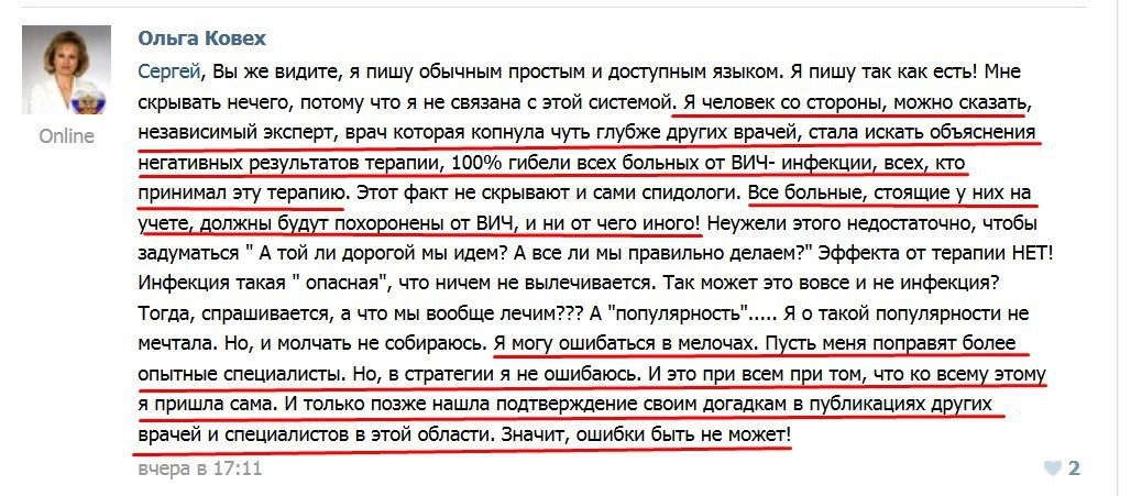 Известно, что 57-летняя женщина за свою карьеру проконсультировала более 50 больных ВИЧ. По телефону и интернету она объясняла заряженным, что лечиться им совершенно необязательно. По подсчётам активистов движения «ВИЧ-диссиденты и их дети», пятеро из ее пациентов скончались.