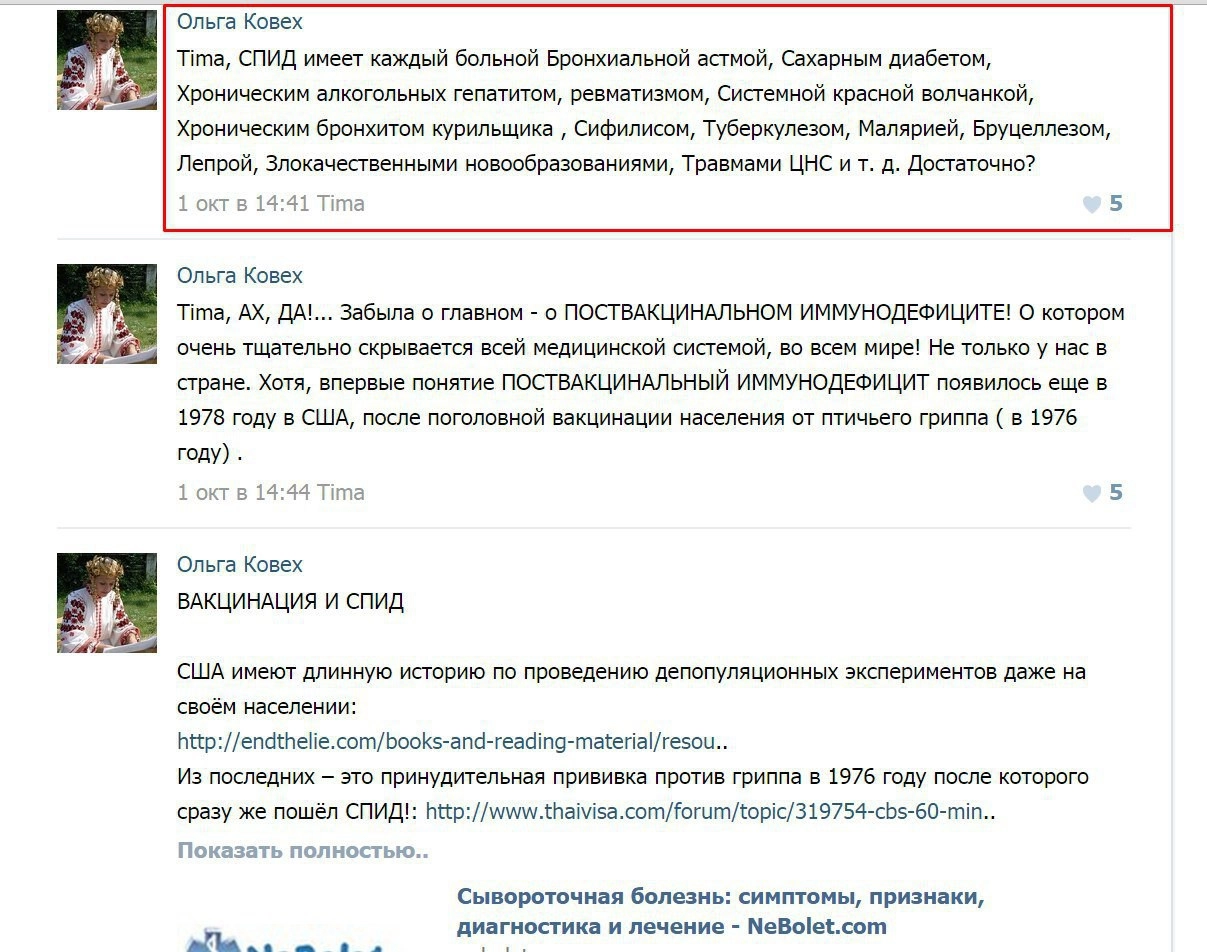 В недавнем интервью выпускница Гродненского государственного медуниверситета заявляла, что СПИД — всего лишь миф и часть глобального заговора по обеспечению мирового господства США. Выгоду от «распространившейся болезни» получают чета Клинтон и Рокфеллеры, считает Ковех.