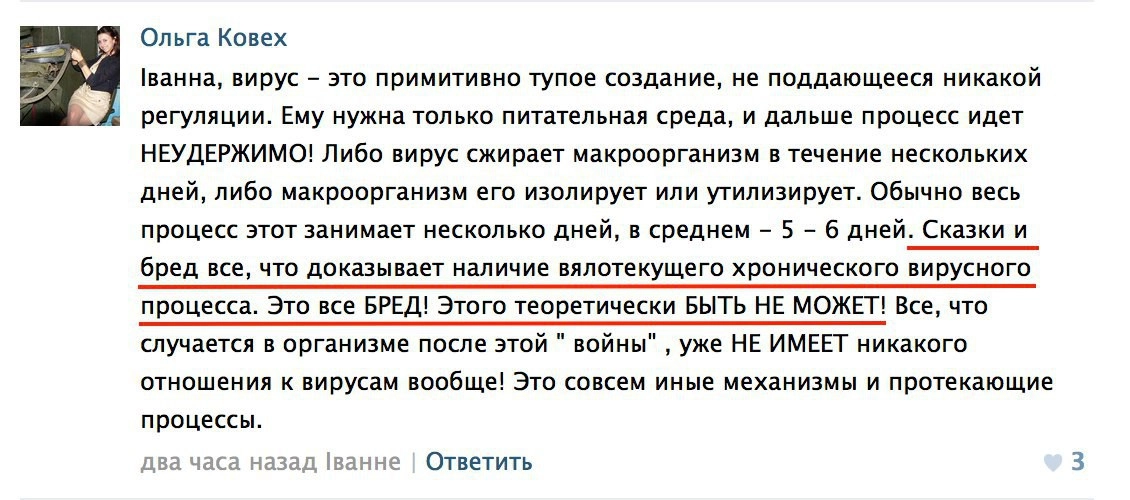 «Одно время у меня даже была мечта стать инфекционистом. Эта специальность для слушателей военно-медицинских факультетов преподавалась на высоком уровне. Требовалось знание ее на пять. У меня и была пятерка. Позже эта базовая подготовка сыграла свою роль: прочитав в начале 90-х брошюрку о том, что СПИДа нет, я ничуть этому не удивилась. Аргументация показалась мне вполне убедительной», — заявляла Ковех в интервью местному порталу.