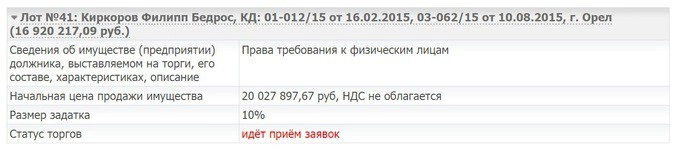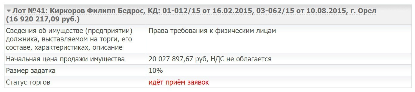 На сайте «Аукционного тендерного центра» можно приобрести кредитный договор на имя Киркорова Филиппа Бедросовича, заключенный с банком «Церих», который обанкротился в 2016 году.