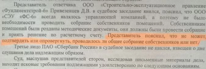 В ходе судебного разбирательства адвокат, представляющий интересы ООО «СЭУ «ФС-6», заявил что «не может подтвердить или опровергнуть, проводилось ли общее собрание или нет».