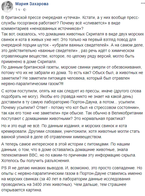 Новость в своем Facebook прокомментировала официальный представитель МИД Мария Захарова. Поспешное «уничтожение» тел питомцев Скрипалей показалось ей подозрительным.