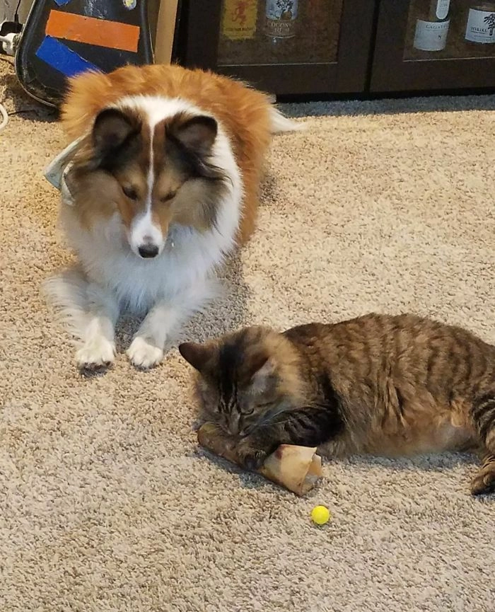 «Кот украл кость у собаки, но та слишком приличная, чтобы забрать ее обратно, поэтому она просто лежит и смотрит на него»