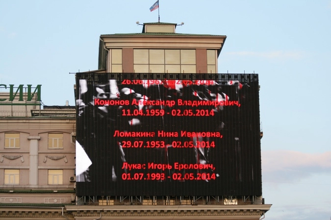 Площадь Ленина. Семь часов вечера. Невзрачная, незакрытая сцена, немного осветительных фонарей на ней. На одном из домов, стоящем прямо вдоль площади огромный экран. На экране, на фоне, кадров с прошлогодних событий в Одессе, где скачут беснующиеся толпы, упивающихся безнаказанностью вурдалаков, медленно плывут имена, разные даты рождения и один на всех день смерти. Люди зрелые, совсем молодежь и пожилые, как потом скажет официальная сатанинская вакханалия, заправляющая теперь в Киеве, сами себя спалившие, а на самом деле, мученики, положившие свои жизни за правду, в списке этих имен…