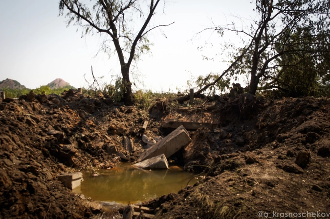 Ракеты, которые ополченцы назвали баллистическими, упали почти в одно и то же место (края воронок в паре-тройке метров друг от друга). Я не увидел на месте укреплённых позиций. Нет здесь, к счастью, и жилых построек. Только пруд и шоссе. Сток из пруда и заполнил углубления, почти наполовину. А дорога, впрочем, здесь уже незаметна: не то, что проехать, а пройти по этому направлению уже затруднительно. У меня на глазах местная женщина пробиралась по краю воронки, цепляясь за траву, около пяти минут.