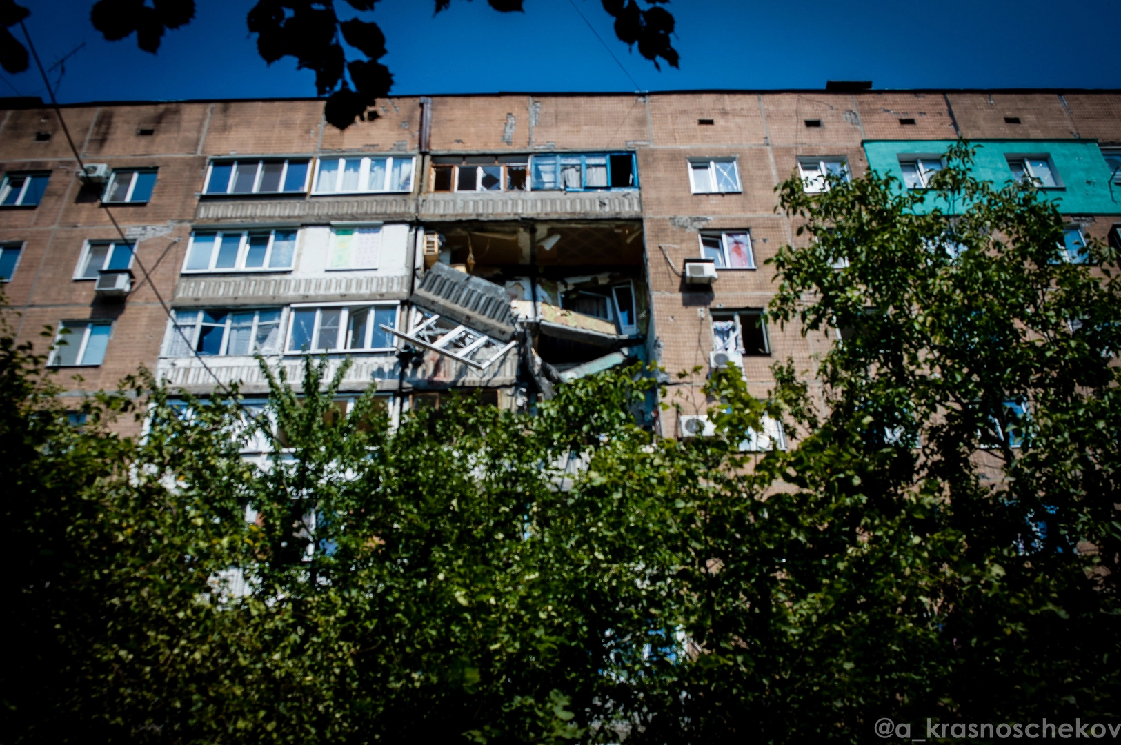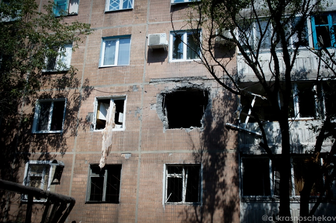 От воронок мы, группой прессы, проследовали уже в сам жилой сектор Петровского. Вот, что мы увидели там. Этим разрушениям тоже не более двух суток. Местные квартиры, судя по всему, посетили гаубичные снаряды.