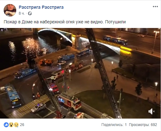 Главный редактор «Говорит Москва» Сергей Доренко, живущий в этом доме, опубликовал в Facebook фотографии и видео, на которых виден густой дым и несколько пожарных машин.