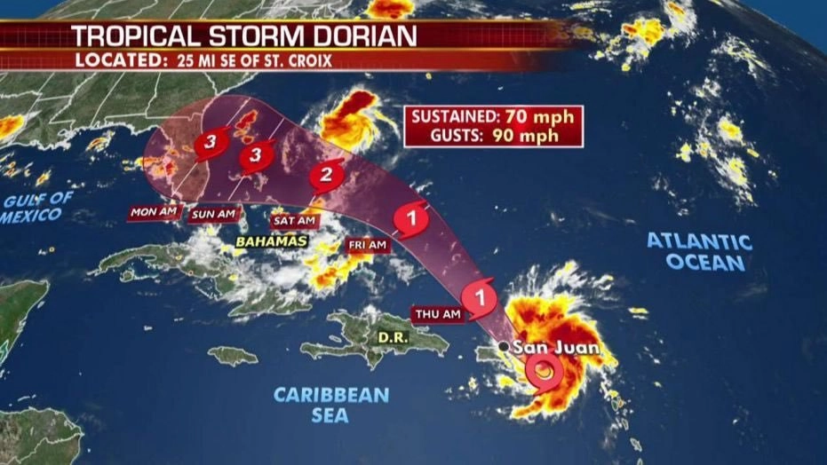 Сейчас «Дориан» находится в 70 километрах к северо-западу от острова Сент-Томас в архипелаге Американские Виргинские острова. Он перемещается в северо-западном направлении со скоростью 6,3 метров в секунду. Скорость ветра в середине вихря составляет 35,8 метров в секунду.