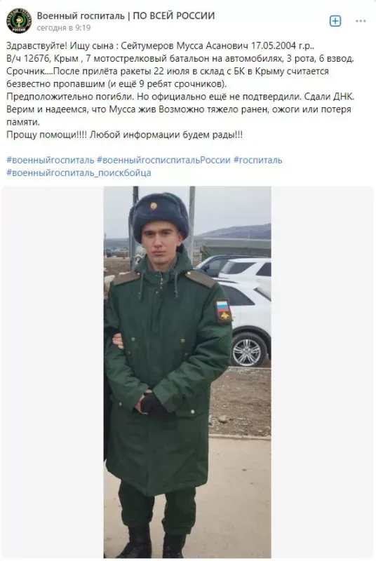 Двадцать второго июля произошёл налёт украинских БПЛА на авиабазу в поселке Октябрьский Красногвардейского района Крыма, во время которого противнику удалось взорвать склад боеприпасов. Глава Республики Крым Сергей Аксёнов заявлял, что в результате взрыва «разрушений и пострадавших, по предварительным данным, нет». Но вскоре в социальных сетях стали появляться сообщения о розыске пропавших без вести. По различным данным, после налёта исчезли от десяти до восемнадцати человек.