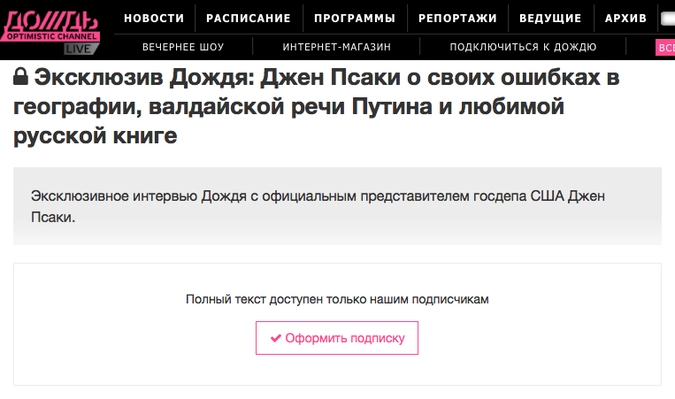«Эксклюзив „Дождя“: Джен Псаки о своих ошибках в географии, валдайской речи Путина и любимой русской книге», — таким интригующим заголовком «оптимистичный» пытается привлечь новую аудиторию. Однако просто так телеканал отдавать «эксклюзив» не хочет: просит оформить подписку на месяц за 480 рублей.