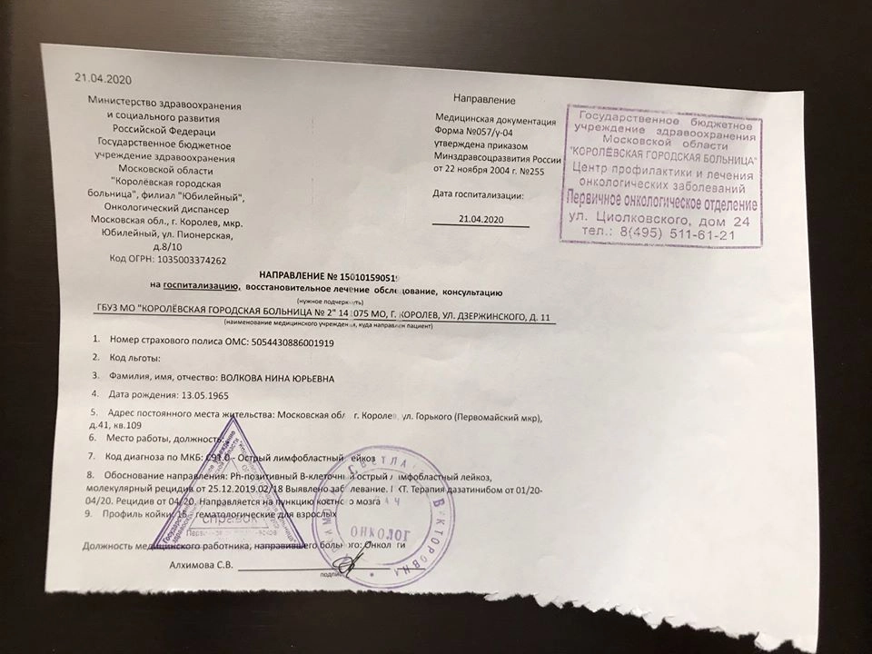 Жительница подмосковного Королева Нина Волкова, страдающая острым лимфобластным лейкозом, не может попасть на госпитализацию якобы по причине карантина. Об этом рассказала ее дочь Марина Волкова.