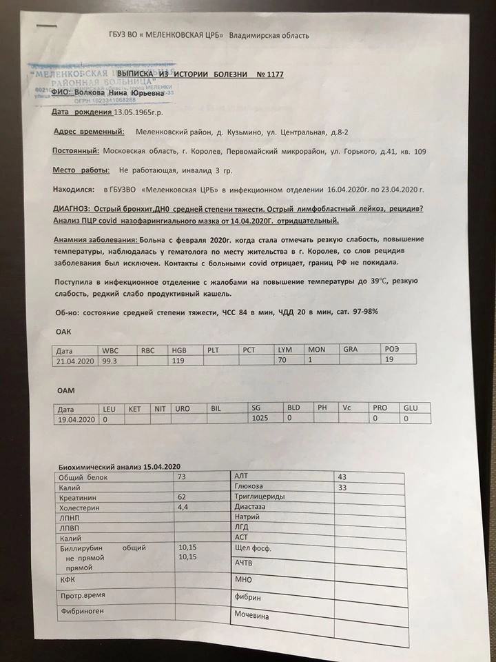 За последние девять дней Нина Волкова обращалась в больницы в нескольких регионах — Москве, подмосковном Королеве, Владимире и Меленковском районе Владимирской области. Как утверждает Марина Волкова, ее матери постоянно отказывали в срочной госпитализации, ссылаясь на карантин по коронавирусной инфекции.