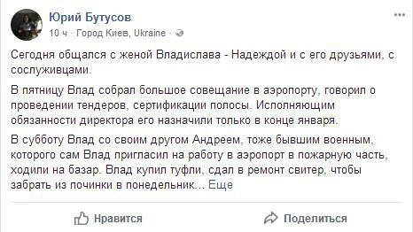 В субботу Влад со своим другом Андреем, тоже бывшим военным, которого сам Влад пригласил на работу в аэропорт в пожарную часть, ходили на базар. Влад купил туфли, сдал в ремонт свитер, чтобы забрать из починки в понедельник. Вечером в субботу резко замкнулся в себе, написал Бутусов в Facebook.