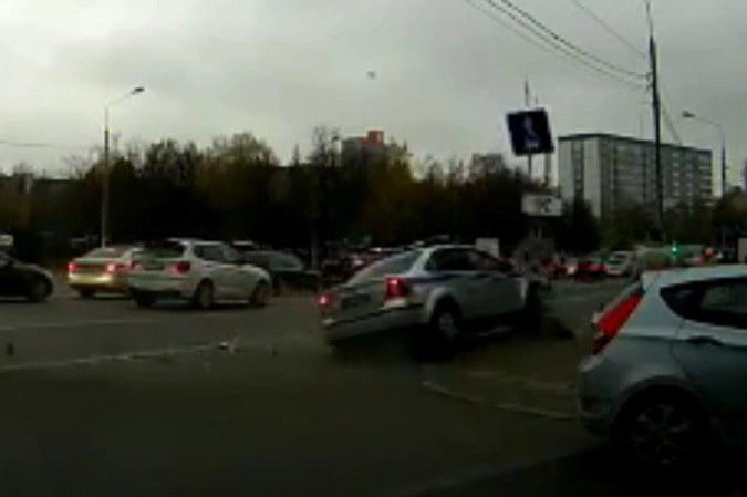 В Москве в районе пересечения улицы Обручева с Научным переулком произошла авария с участием полицейского автомобиля. Момент столкновения попал в объектив видеорегистратора случайного свидетеля.
