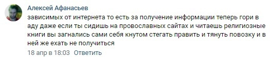 Интернет-зависимость очень близка к наркомании, к греху пьянства. Человек фактически отключается реальной жизни, наносит вред своему здоровью и близким своим. Не случайно на исповедях люди обычно переживают и раскаиваются, что очень много времени уделяют интернету, — добавил Душенков.