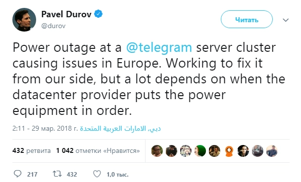 «Проблемы с работой Telegram в Европе связаны с отключением электропитания серверного кластера», — написал Дуров на своей страничке в Twitter.