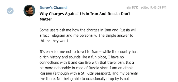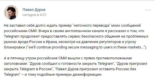 «Вчера в своем англоязычном канале я рассказал о том, что Telegram продолжит предоставлять сервис безопасного общения на проблемных рынках вроде России и Ирана, несмотря на давление регуляторов и угрозу блокировки («we'll continue providing secure messaging to users in these markets…»)", — написал он на своей страничке ВК.