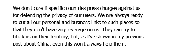 «Поэтому нас не волнуют обвинения некоторых стран из-за того, что мы защищаем личные данные наших пользователей. Мы готовы в любой момент оборвать все наши личные и профессиональные связи с этими странами, чтобы лишить их рычагов воздействия на нас», — написал бизнесмен.