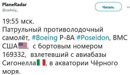 Позже с этой же базы вылетел патрульный противолодочный самолет ВМС США Boeing P-8A Poseidon и направился к южным границам Крыма.