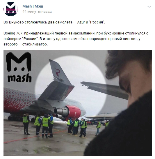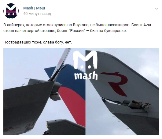 Лайнеры авиакомпаний «Россия» и Аzur столкнулись в московском аэропорту Внуково.