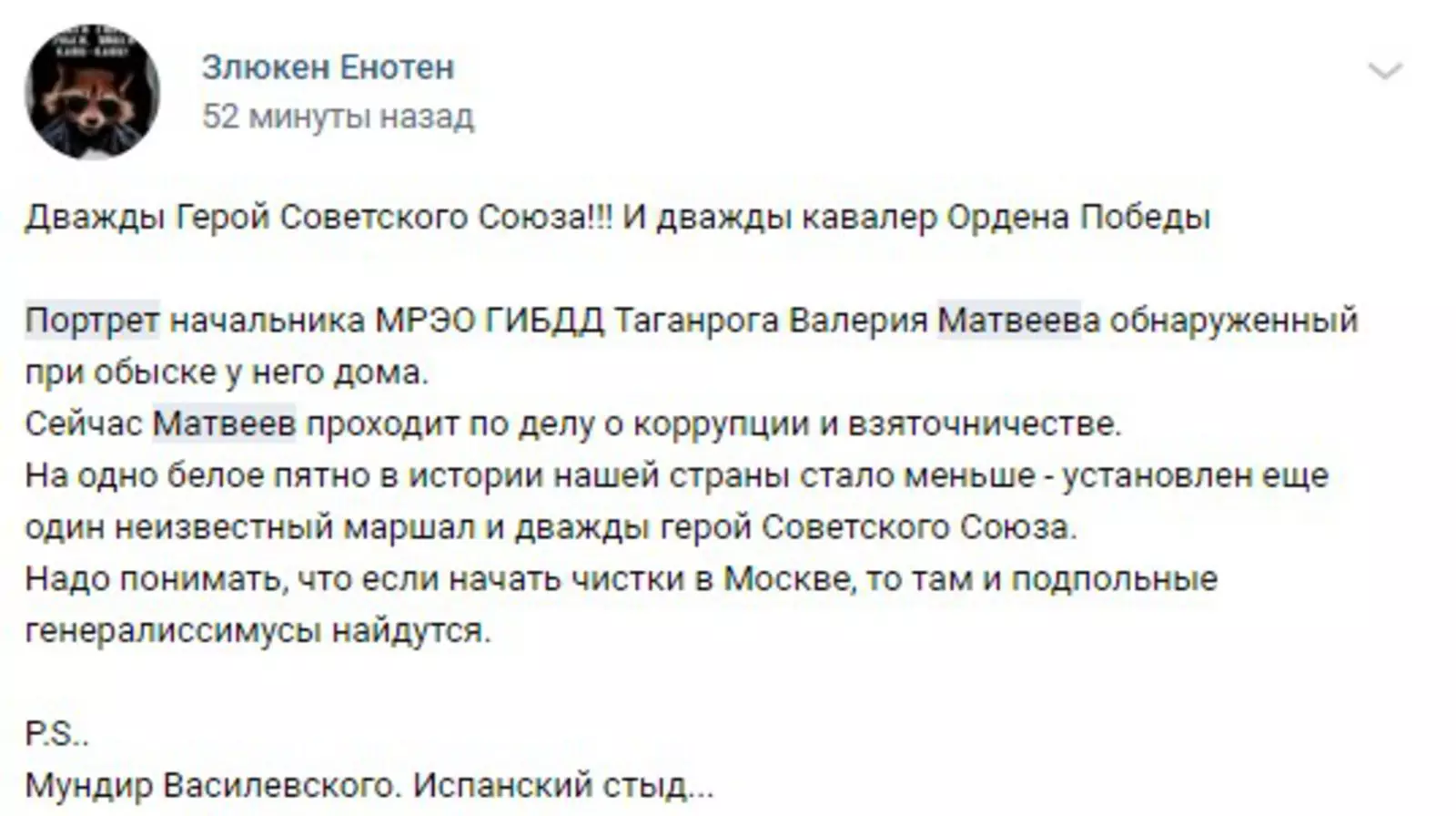 Одной из главных тем для обсуждения в Рунете стал портрет обвиняемого во взяточничестве руководителя межрайонного регистрационно-экзаменационного отдела (МРЭО) ГИБДД Таганрога Валерия Матвеева в маршальской форме со всеми регалиями.