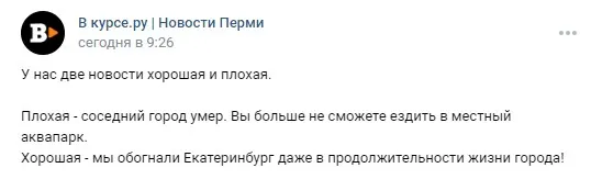 Шуточки про «могилу Екатеринбурга» отпускают и медиа соседних регионов. Например, не удержалось пермское «В курсе»: «Мы обогнали Екатеринбург даже в продолжительности жизни города!»