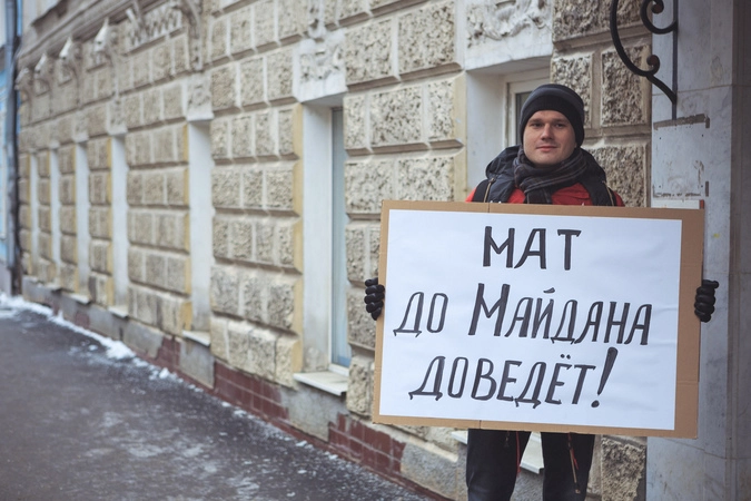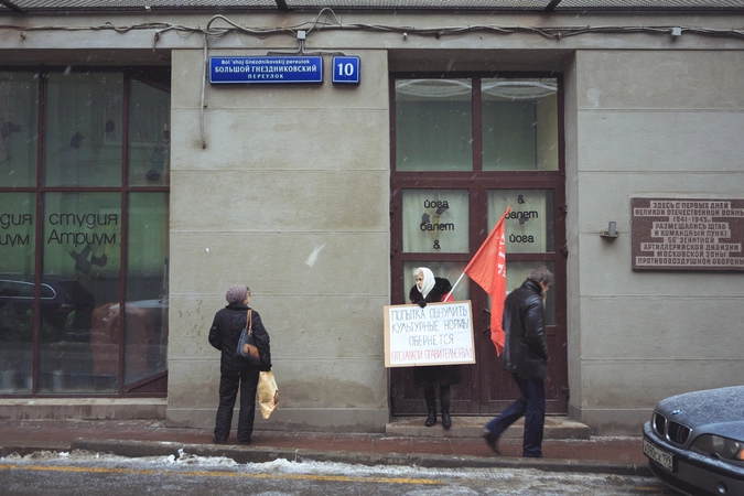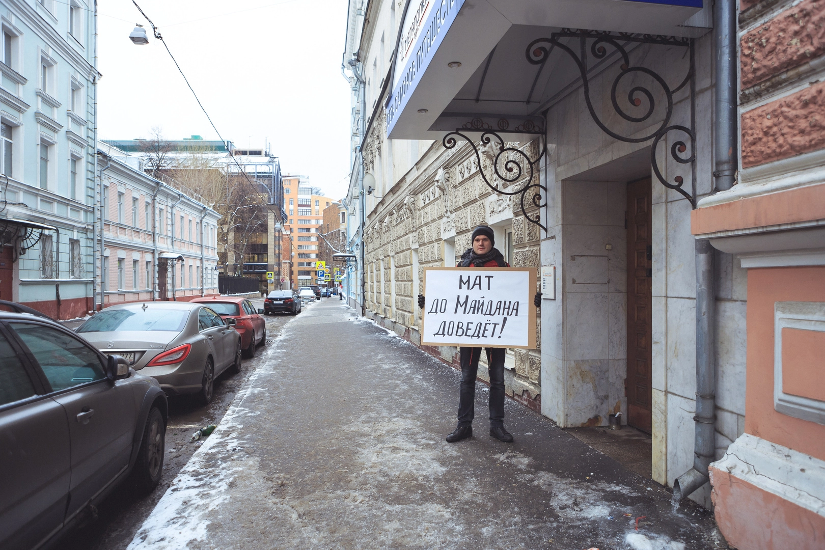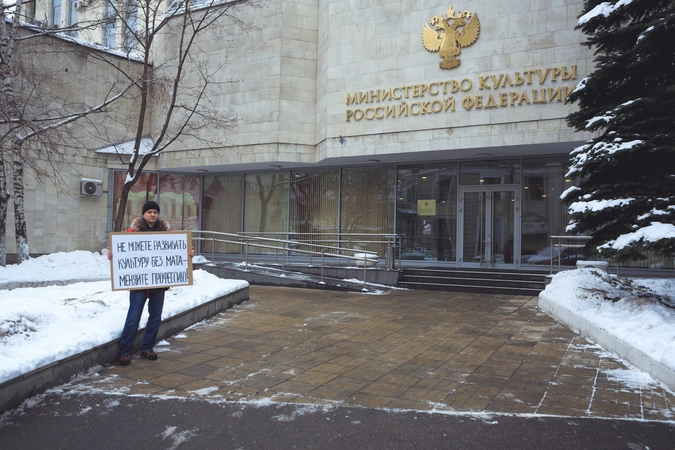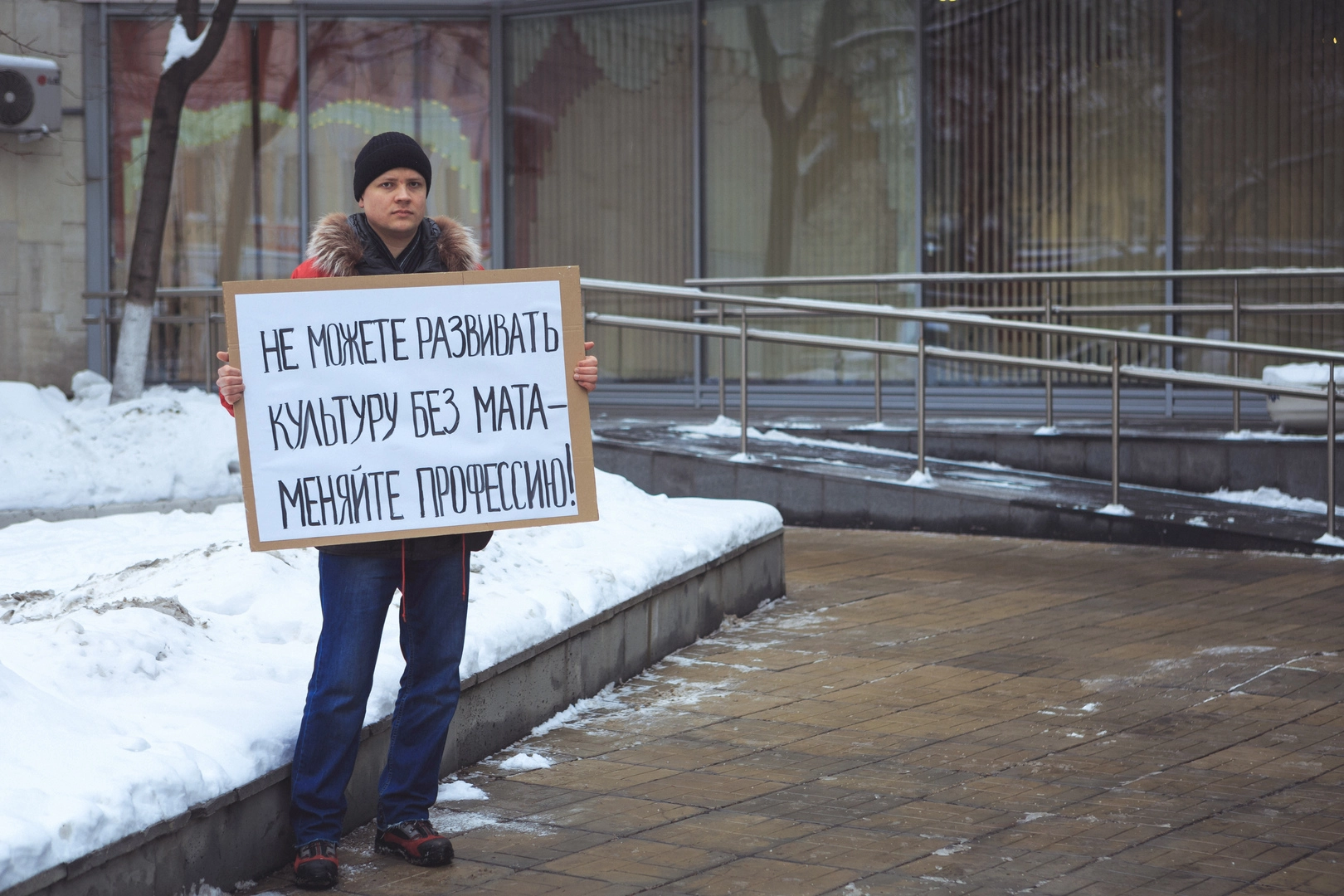 У здания Министерства Культуры РФ прошла очередная серия одиночных пикетов против внесения законопроекта о возвращении мата в кино. Митингующие активисты движения «Суть времени» считают, что данная инициатива противоречит культурным традициям России и дает возможность не только «художественно» ввернуть крепкое словцо, но применять любую низкую пошлость, прикрывшись значком «18+».