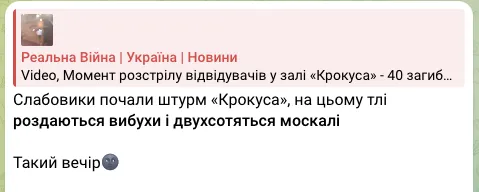 «Слабовики начали штурм „Крокуса“, на этом фоне раздаются взрывы и двухсотятся москали. Такой вечер», — сообщает подписчикам украинский Telegram-канал с миллионной аудиторией.