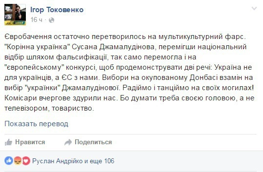 «Евровидение окончательно превратилось в мультикультурный фарс. «Коренная украинка» Сусанна Джамалудинова, победив национальный выбор путем фальсификации, точно так же победила и на «европейском» конкурсе, чтобы продемонстрировать две вещи: Украина не для украинцев, а ЕС с нами», — пояснил свободовец и призвал «думать головой».