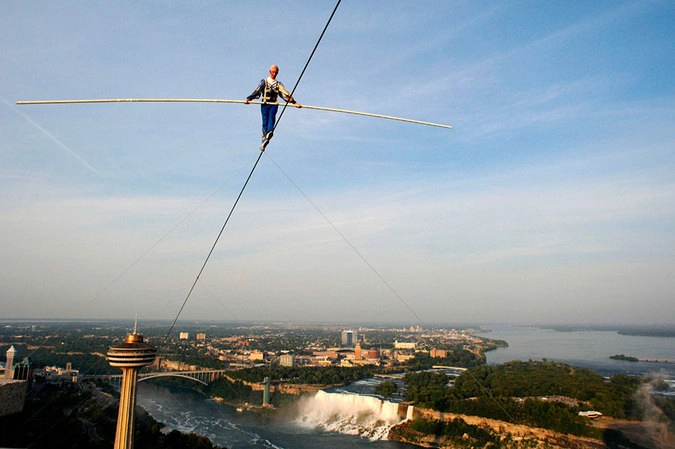 340-метровый трос был натянут между небоскребом Skylon Tower и гостиницей Fallsview Hilton в городе Ниагара-Фоллс. Стоит отметить, что трос шел вверх, и 68-летнему Кокрану пришлось подняться на десять метров. Конечная точка находилась на высоте 177 метров.