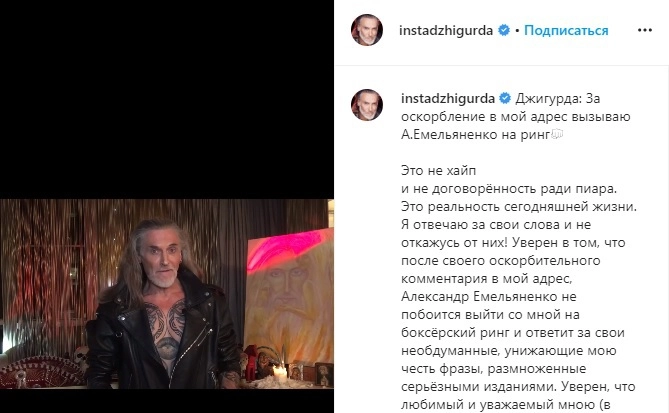 «Уверен в том, что после своего оскорбительного комментария в мой адрес, Александр Емельяненко не побоится выйти со мной на боксёрский ринг и ответит за свои необдуманные, унижающие мою честь фразы, размноженные серьёзными изданиями», — заявляет Джигурда.