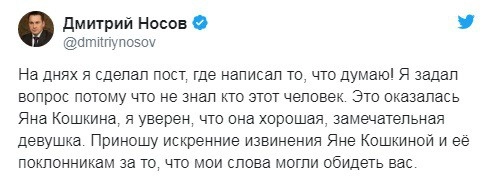 «На днях я сделал пост, где написал то, что думаю! Я задал вопрос, потому что не знал, кто этот человек. Это оказалась Яна Кошкина, я уверен, что она хорошая, замечательная девушка. Приношу искренние извинения Яне Кошкиной и ее поклонникам за то, что мои слова могли обидеть вас», — написал Носов на личной страничке в Twitter.