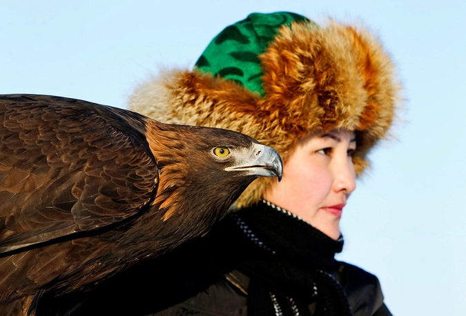 Макпал Абразакова со своим беркутом Акжелке. © Шамиль Жуматов/Reuters