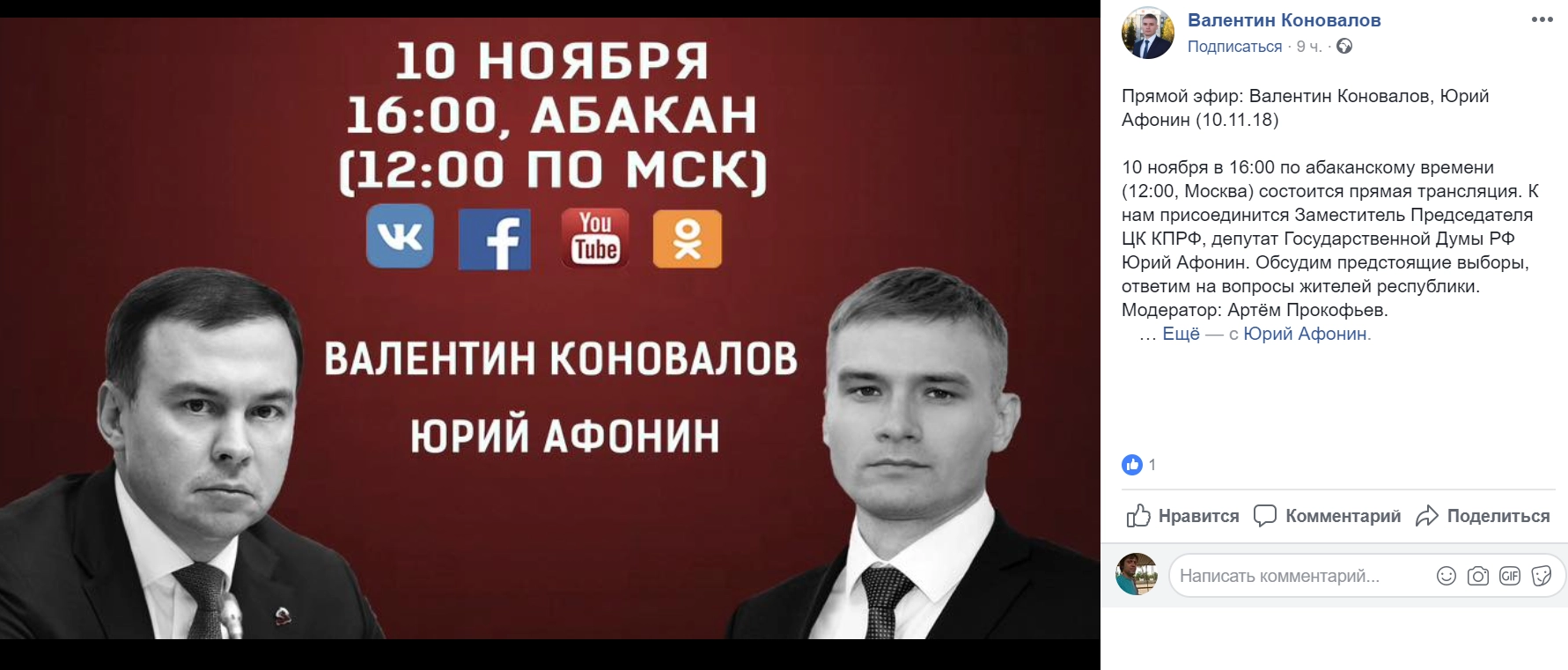 Второй тур выборов главы Хакасии пройдет в воскресенье, 11 ноября. В первом туре, который состоялся 9 сентября, участвовали действующий на тот момент губернатор Виктор Зимин (32,42% голосов), Валентин Коновалов (44,81%), Андрей Филягин от СР (11,23%) и Александр Мяхар от «Партии роста» (6,61%). Позже Зимин, Филягин и Мяхар от дальнейшей борьбы за кресло главы региона отказались. Таким образом, Коновалов остался единственным кандидатом. Если в его поддержку выскажутся более 50% избирателей, то он станет губернатором Хакасии.
