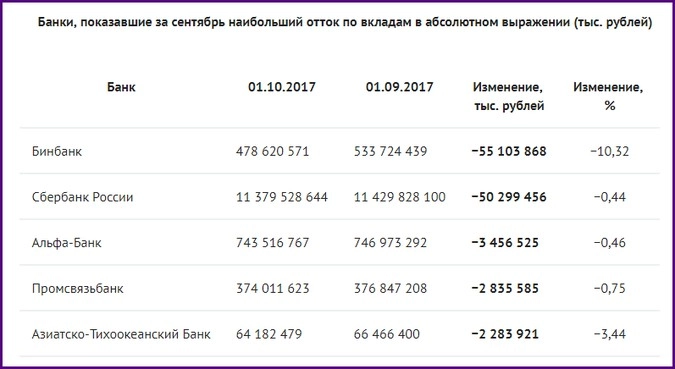 В конце октября российская система банковского учета (РСБУ) сообщала, что за сентябрь розничные клиенты забрали из Бинбанка вкладов на 55,1 миллиарда рублей, а из Сбербанка — на 50,3 миллиарда рублей.