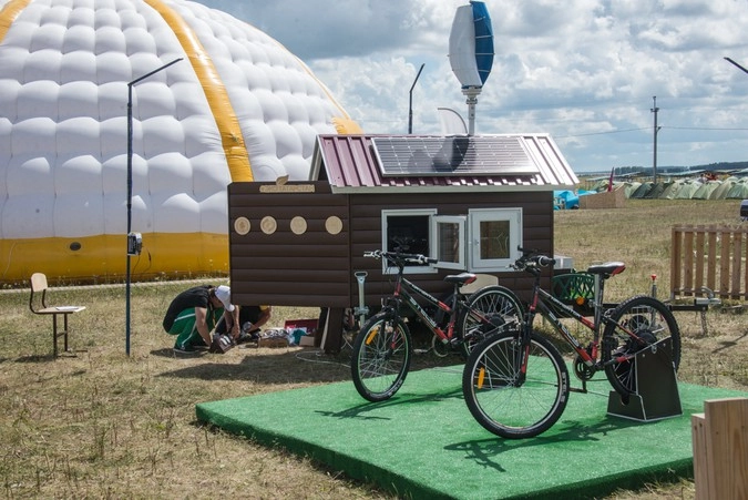 Зарядить свои гаджеты участники форума могут в специальном эко-домике, который работает за счет солнечной, ветровой и вело-энергии.