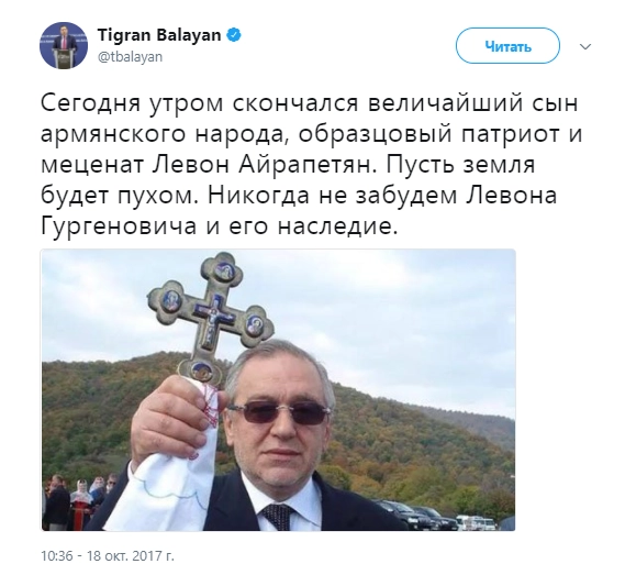 Бывший глава издательского дома «Собеседник» Левон Айрапетян скончался в мордовской колонии № 12 на 68-м году жизни. Об этом сообщил пресс-секретарь МИД Армении Тигран Балаян.
