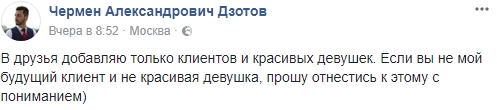 29-летний писатель и пиарщик, как он сам позиционирует себя, не встретил сочувствия у интернет-пользователей. Многие предположили, что девушка Дзотова побоялась, что в Сети могут появиться и ее откровенные снимки.