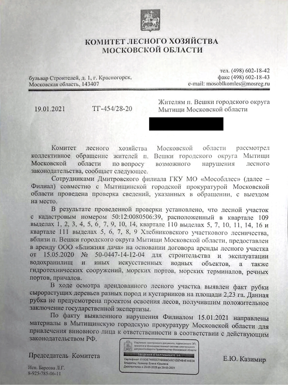 Экоактивисты передали «Ридусу» письмо от главы Комитета лесного хозяйства Елены Казимир от 19 января, в котором вырубка деревьев, вопреки словам Валерия Белоцерковского, признана незаконной: