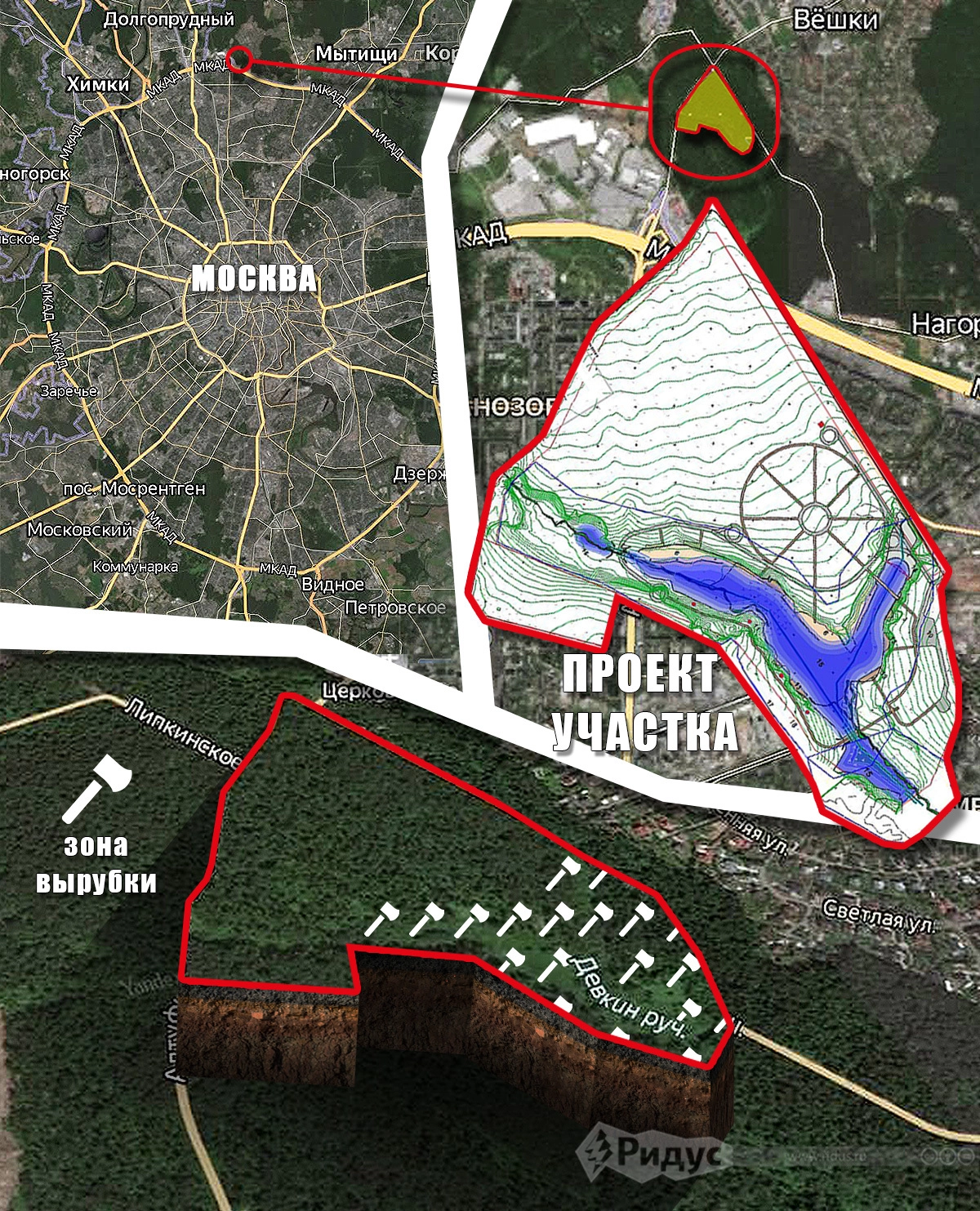 В прошлом году Белоцерковский оформил в аренду на свою компанию ООО «Ближняя дача» участок леса почти в 23 гектара к югу от пересечения Липкинского и Алтуфьевского шоссе — там где протекает Девкин ручей. Предприниматель утверждает, что цели у него благие: превратить участок дикого леса в рекреационную зону с искусственным водоемом, дорожками, мостками набережной и двумя насыпными пляжами, причем все — за свой собственный счет.
