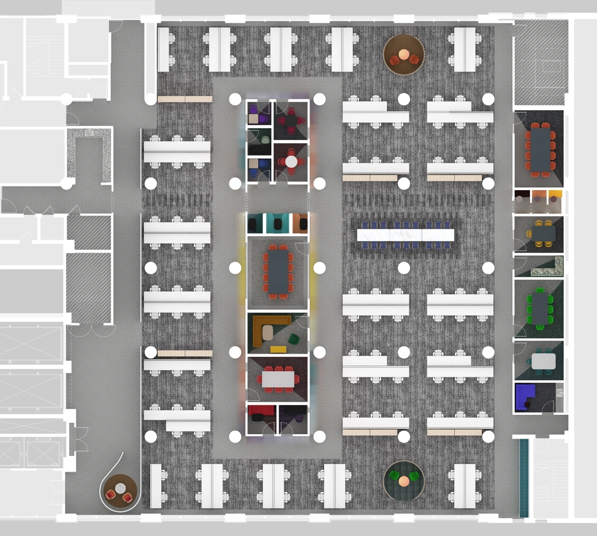 Специалисты Utile «разорвали» единую рабочую зону по этажу, внедрив несколько зон переговорок и коворкингов. Зоны отделили не глухими перегородками, а перфорированными листами железа.