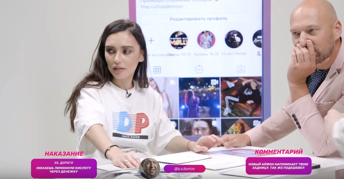 Бывшая солистка группы Serebro Ольга Серябкина стала участницей нового выпуска шоу вместе с блогером Данилой Поперечным. Певице выпал Сергей Лавров и комментарий: «Новый айфон напоминает твою задницу, так же подешевел».