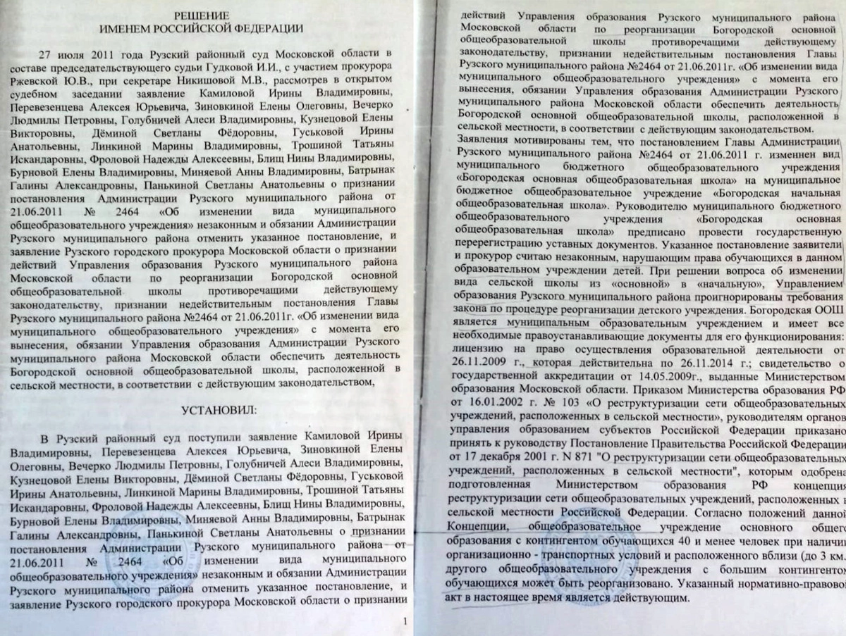 Как сообщила «Ридусу» неравнодушная местная жительница Наталья Черепанова, первые попытки реорганизовать школу были еще в 2011 году — тогда лишилась своего поста директор Валентина Николаевна Машкова. Администрация Рузского района пыталась переформировать школу в начальную, но это удалось оспорить в суде: было установлено, что решение нарушает права обучающихся в школе детей. При этом было предписание суда школу укомплектовать в соответствии с требованиями, но на протяжении долгих лет это просто не делали.