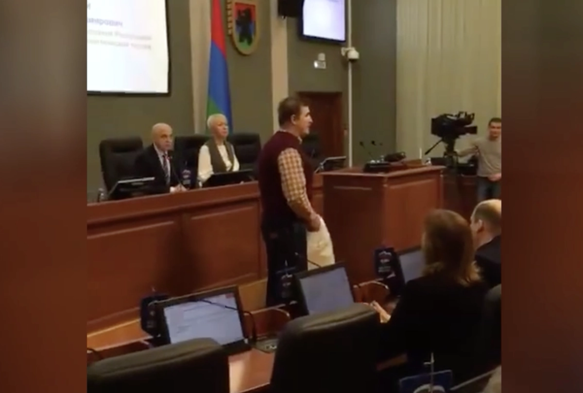 Внеочередное заседание парламента Республики Карелия 10 февраля, на котором региональные депутаты рассматривали поправки к бюджету на 2020 год, было прервано оригинальной акцией протеста. Сразу после исполнения гимна к президиуму заксобрания подошел человек, назвавший себя подполковником ФСБ в отставке Сергеем Андруневичем, и вручил спикеру парламента Элиссану Шандаловичу два рулона туалетной бумаги.