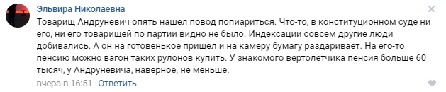 Как сообщает URA.RU, Андруневич возмутился тем, что после того, как ветеранские выплаты не индексировались в республике 12 лет, под давлением Конституционного суда власти Карелии увеличили сумму компенсации ветеранам за услуги общественного транспорта и связи на 21 рубль. По словам подполковника в отставке, этой суммы недостаточно даже для одной поездки по Петрозаводску.