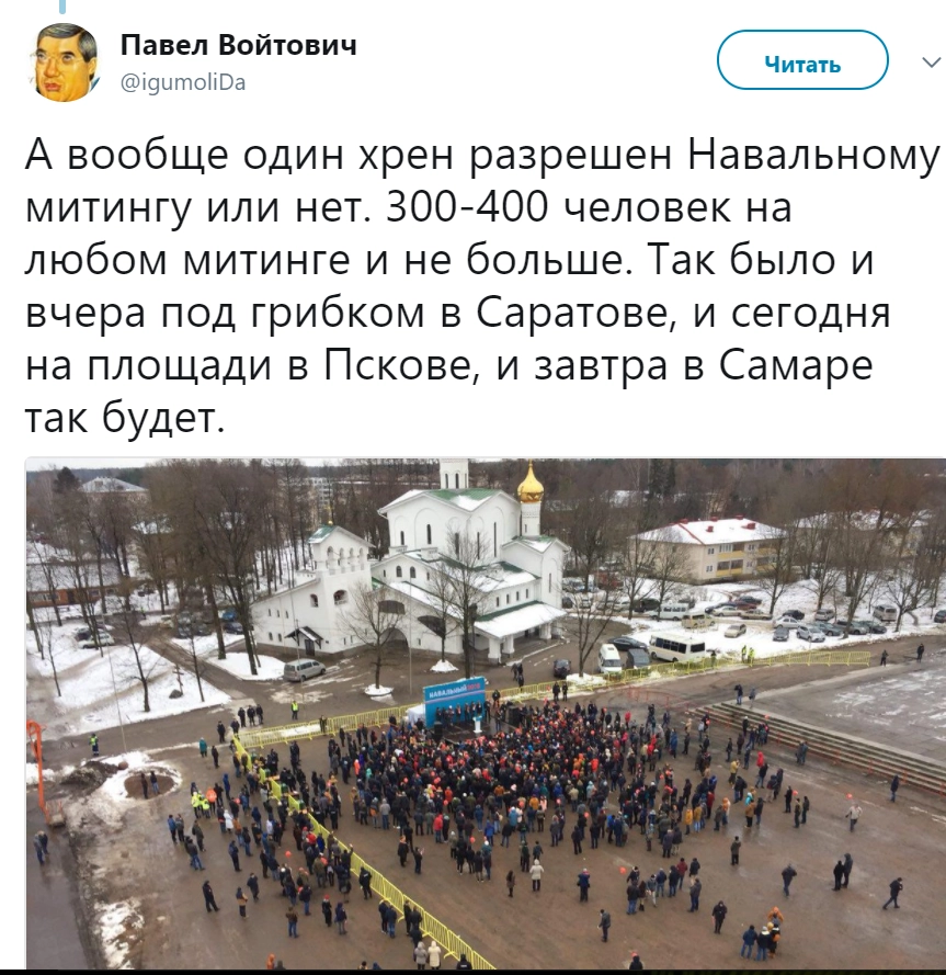 В субботу он провел в Пскове согласованный митинг. А днем раньше — не согласованный, в Саратове. В воскресенье же у него запланирован снова незаконный митинг. На этот раз снова в Поволжье, в Самаре.