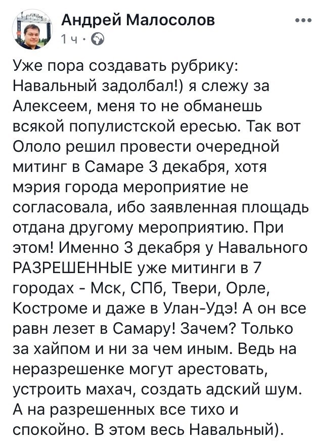 Как ранее писал «Ридус», Навальный внес несанкционированный самарский митинг в свой «гастрольный график», проигнорировав семь подобных мероприятий, которые разрешены местными властями: акции блогера согласованы в этот же день в Москве, Санкт-Петербурге, Твери, Орле, Улан-Удэ, Костроме и Кургане.