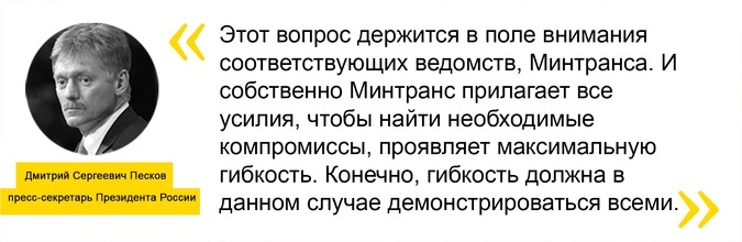 Пресс-секретарь президента РФ Дмитрий Песков, комментируя возможность возникновения проблем с поставками продуктов из-за ситуации с дальнобойщиками в России, заявил, что всем сторонам нужно проявлять гибкость и найти компромисс, сообщает газета «Взгляд».