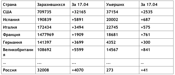 Если сравнивать мировые культурные и экономические центры, то в Москве количество зараженных 18,1 тысячи (умерших 127 человек, меньше 1%), в Лондоне — 18,9 тысячи (умерших 3,3 тысячи человек — 17,5%), в Мадриде — более 51 тысячи (7 тысяч смертей — 13,7%), в Нью-Йорке 123 тысячи случаев заражения (11 тысяч умерших — 8,9%).