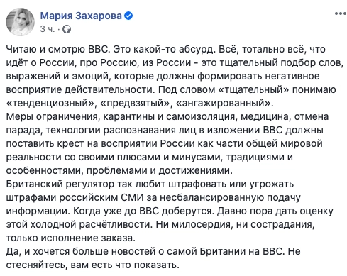 «Меры ограничения, карантины и самоизоляция, медицина, отмена парада, технологии распознавания лиц в изложении ВВС должны поставить крест на восприятии России как части общей мировой реальности со своими плюсами и минусами, традициями и особенностями, проблемами и достижениями. Британский регулятор так любит штрафовать или угрожать штрафами российским СМИ за несбалансированную подачу информации. Когда уже до ВВС доберутся», — написала Захарова на своей странице в Facebook.